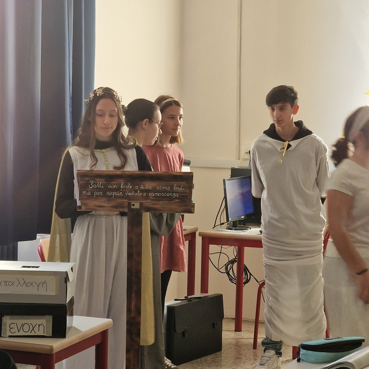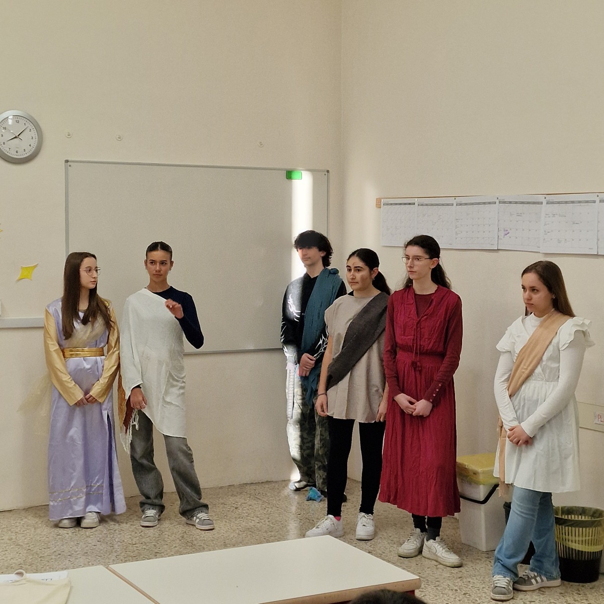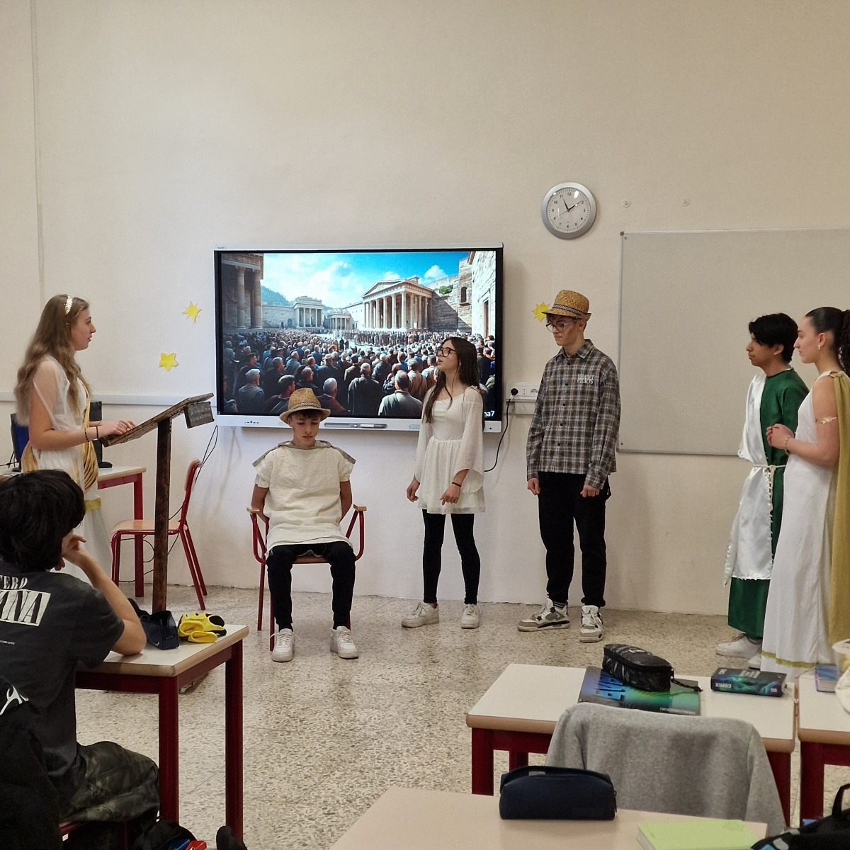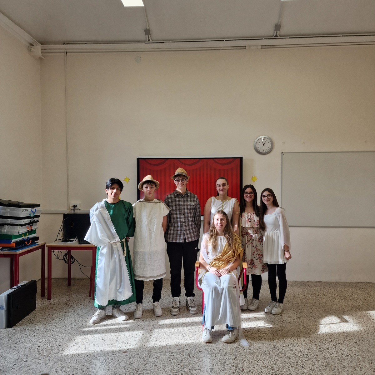 Tutta la classe ha lavorato in modo attivo e collaborativo: gli studenti hanno svolto ricerche, selezionato le informazioni essenziali, scritto brevi discorsi, curato la sceneggiatura e si sono persino procurati semplici costumi per rendere più credibile la rappresentazione. Per molti si trattava della prima esperienza di recitazione, ma l’impegno, la serietà e l’entusiasmo hanno dato vita a un risultato davvero significativo.