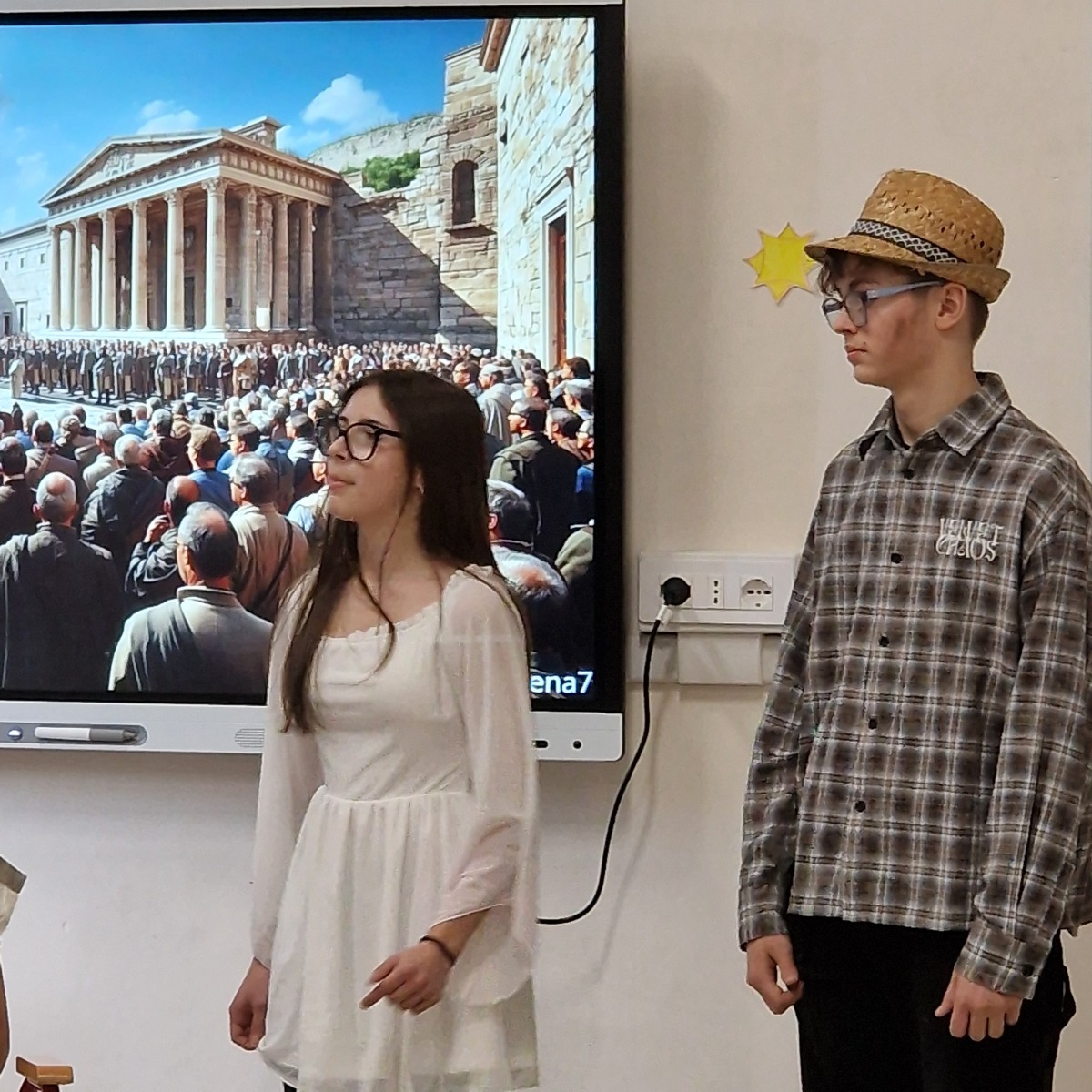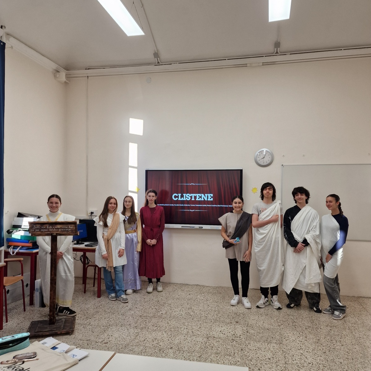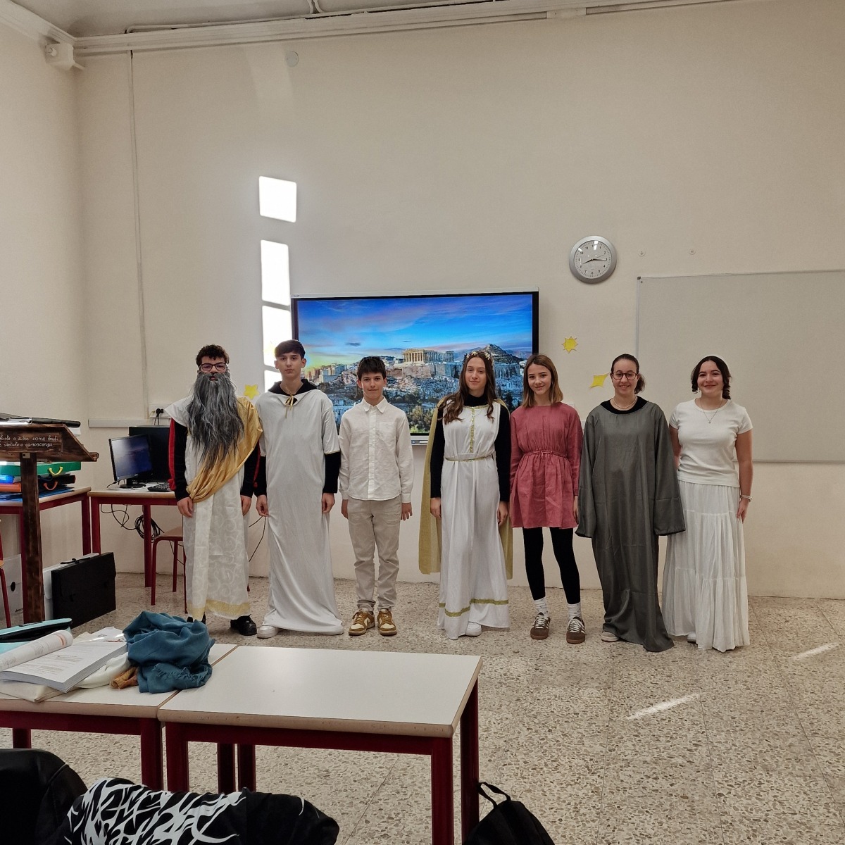 Tutta la classe ha lavorato in modo attivo e collaborativo: gli studenti hanno svolto ricerche, selezionato le informazioni essenziali, scritto brevi discorsi, curato la sceneggiatura e si sono persino procurati semplici costumi per rendere più credibile la rappresentazione. Per molti si trattava della prima esperienza di recitazione, ma l’impegno, la serietà e l’entusiasmo hanno dato vita a un risultato davvero significativo.