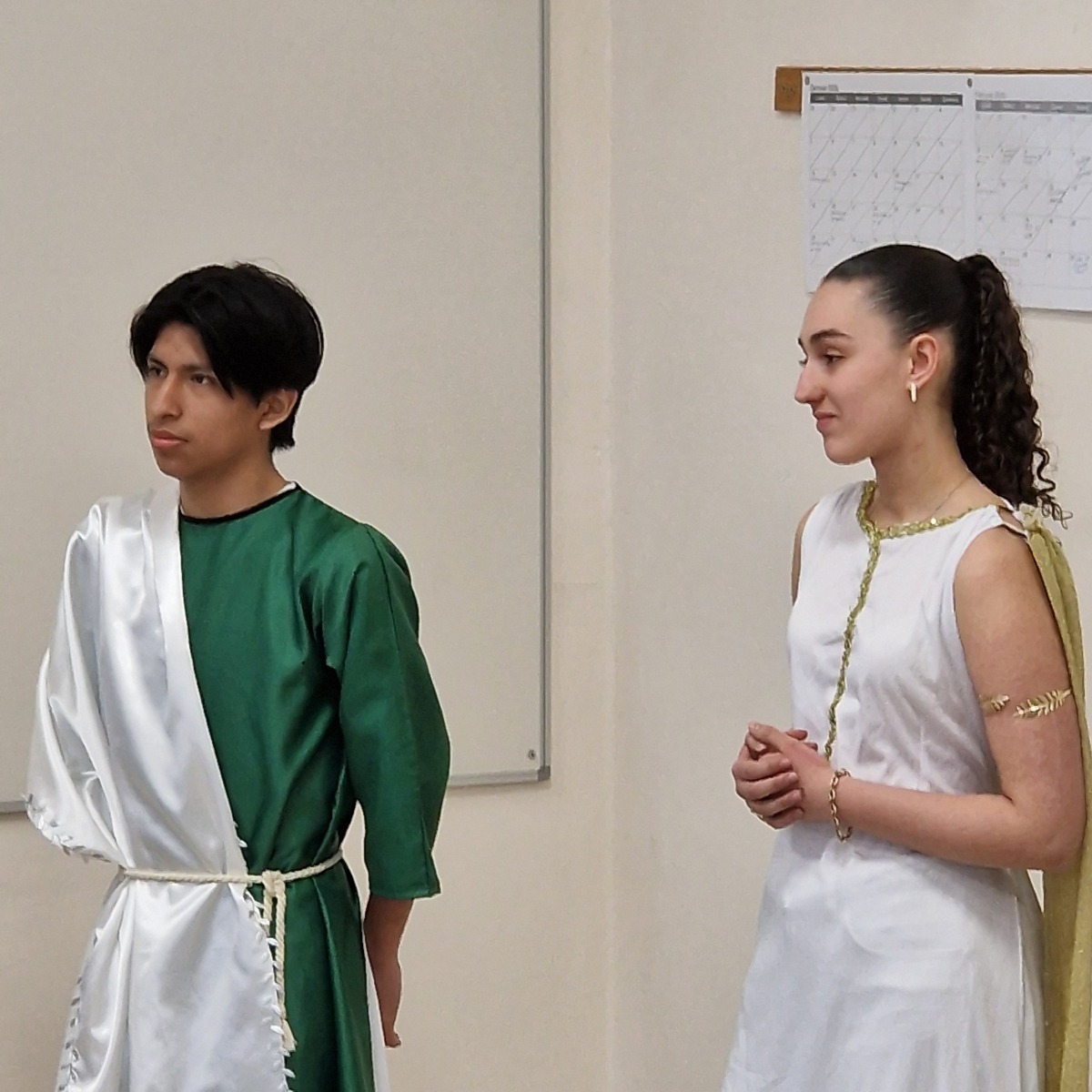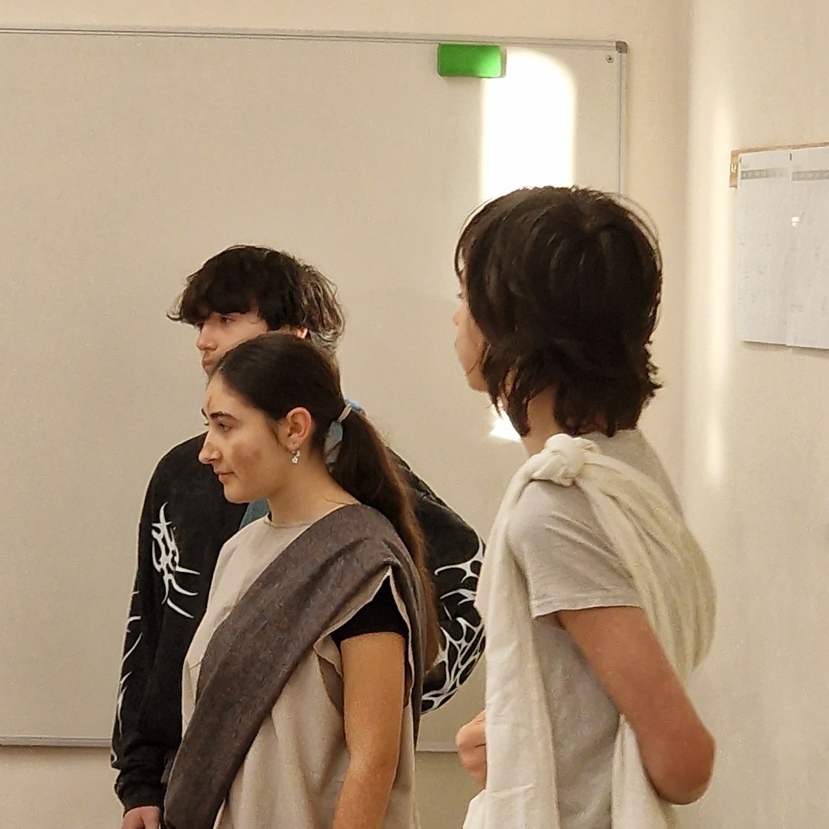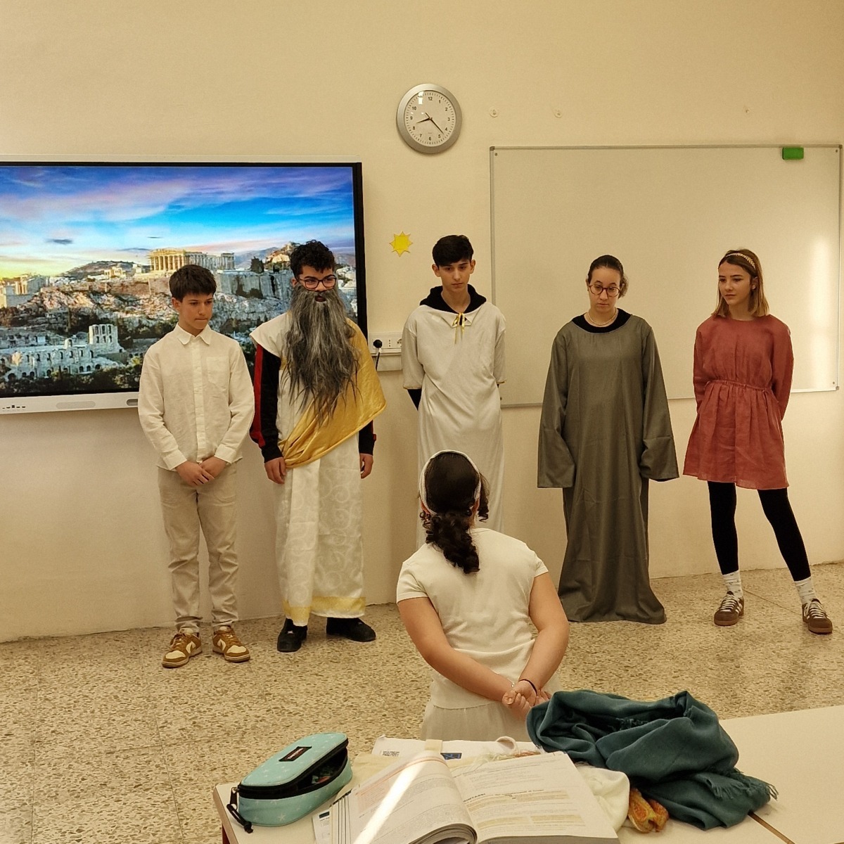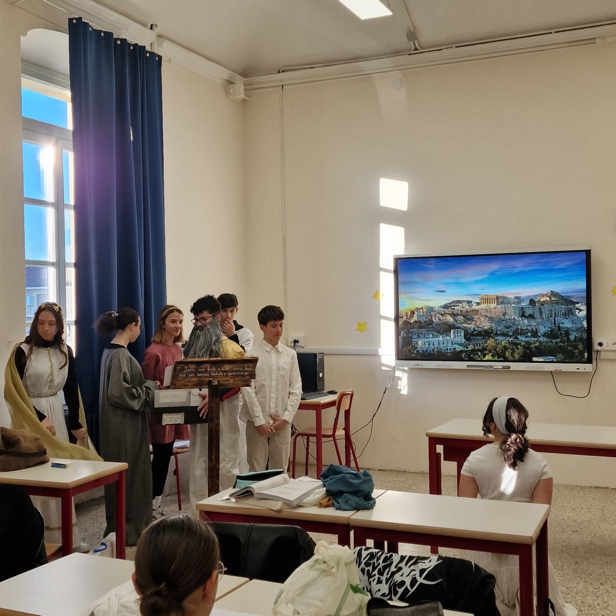 Tutta la classe ha lavorato in modo attivo e collaborativo: gli studenti hanno svolto ricerche, selezionato le informazioni essenziali, scritto brevi discorsi, curato la sceneggiatura e si sono persino procurati semplici costumi per rendere più credibile la rappresentazione. Per molti si trattava della prima esperienza di recitazione, ma l’impegno, la serietà e l’entusiasmo hanno dato vita a un risultato davvero significativo.